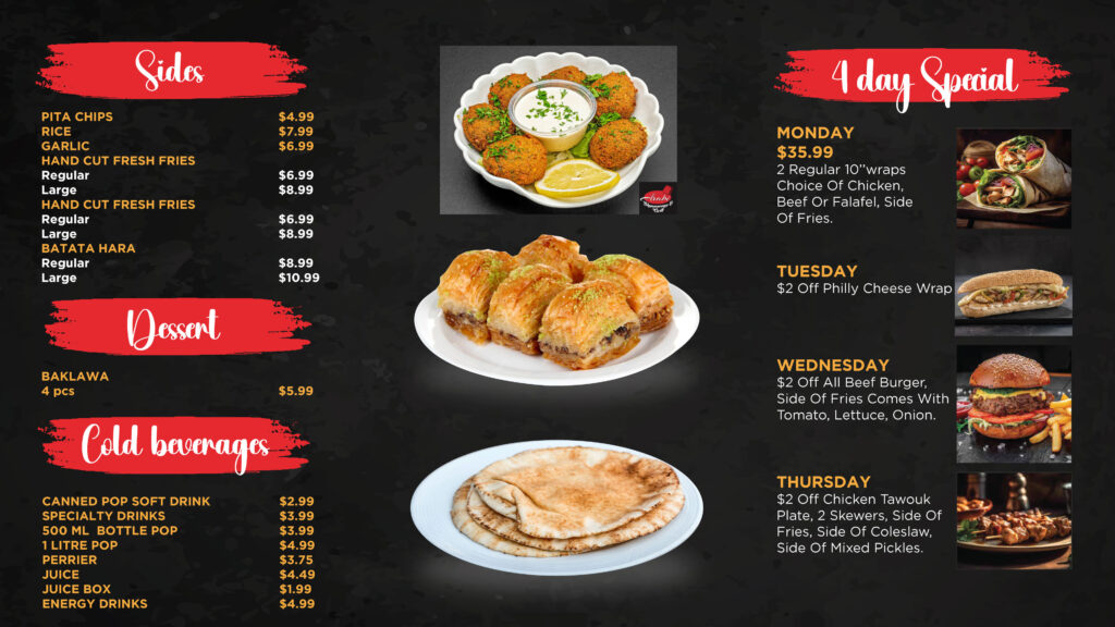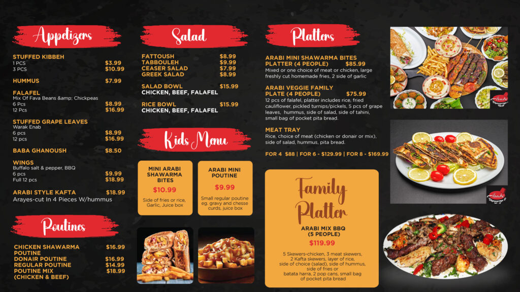 Arabi Shawarma Grill is committed to providing you with the best experience, whether it’s in the comfort of your own home using our pick-up and delivery options, or while dining at the restaurant. Please check out our delivery options as we offer skip the dishes as well as Door Dash.